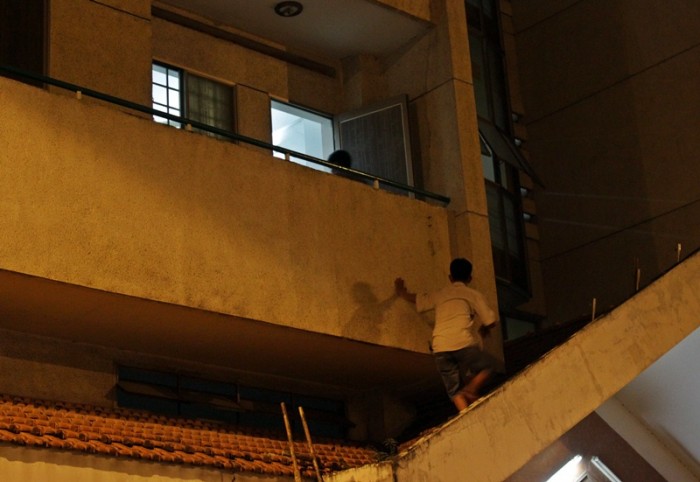 Thông tin ban đầu, khoảng thời gian trên ông Nguyễn Hướng Quang, 46 tuổi ngụ tại lầu 1 khu D chung cư, khóa cửa phòng bên trong rồi ra ngoài hành lang ban công đứng thẫn thờ.