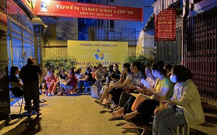 | Phụ huynh xếp hàng từ nửa đêm để nộp hồ sơ cho con vào trường THPT Hoàng Cầu |