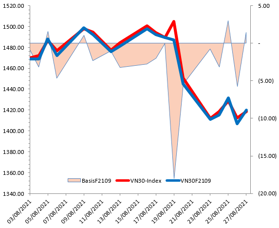 Kết phiên, basis hợp đồng VN30F2109 đảo chiều và đạt giá trị 1,43 điểm. Điều này cho thấy nhà đầu tư đã lạc quan trở lại về triển vọng của VN30-Index.