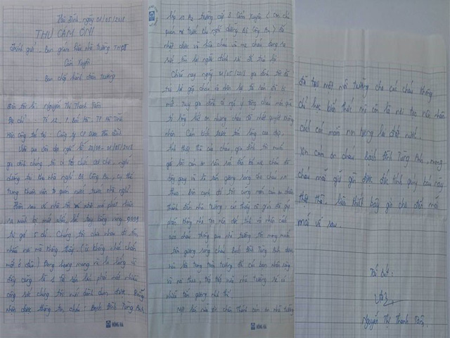 | Lá thư cảm ơn của chị Tâm gửi đến trường THPT Cẩm Xuyên. |