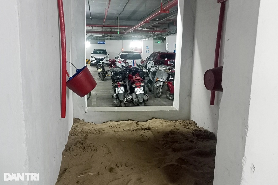 Lo ngại việc pin xe điện cháy khó dập tắt bằng các bình chữa cháy thông thường, chung cư Đại Kim đã bố trí cả khu vực chứa cát để xử lý khi gặp sự cố hỏa hoạn.