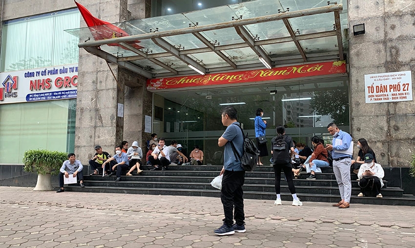 Những người này tập trung quanh khu vực tiếp nhận của chủ đầu tư. Người ngồi ở ghế đá trên vỉa hè. Người thì ngồi ngay ở bậc thang. Mỗi người cầm một tập hồ sơ trên tay.