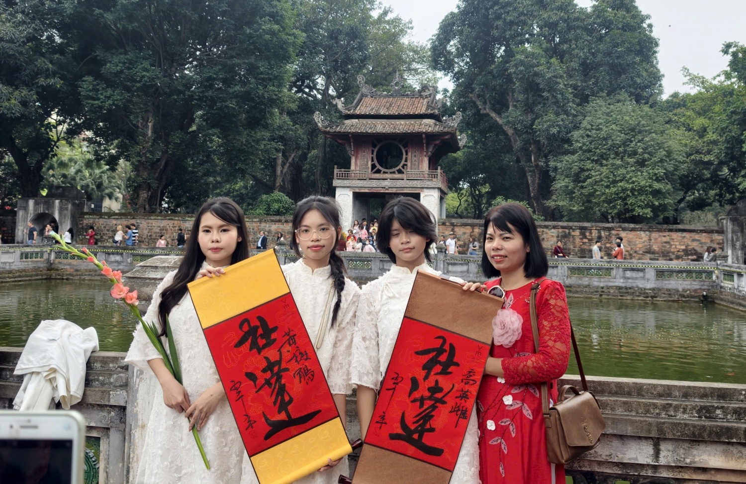 Từ sáng sớm, nhiều gia đình đã đưa con em tới đây với mong muốn cầu chúc cho một năm học hành tiến bộ, thi cử hanh thông. Những nhóm bạn trẻ trong tà áo dài truyền thống tranh thủ ghi lại khoảnh khắc đầu năm, trong khi các bậc cao niên thành kính dâng hương, gửi gắm ước vọng bình an, thuận lợi. Sự giao hòa giữa nét linh thiêng và nhịp sống đương đại khiến không gian Văn Miếu vừa trang nghiêm, vừa gần gũi.
