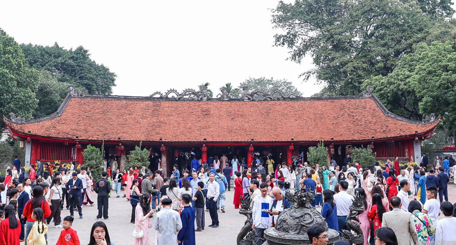 Dù lượng khách tăng cao, công tác tổ chức, phân luồng vẫn được thực hiện nền nếp, đảm bảo không gian tham quan thông thoáng, an toàn. Trong tiết trời Xuân dịu nhẹ, từng dòng người chậm rãi dạo bước qua Khuê Văn Các, bia tiến sĩ, Thái Học…, lắng nghe câu chuyện về truyền thống tôn sư trọng đạo của dân tộc.