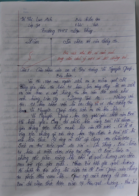 Chúng tôi cũng có dịp gặp thầy Nguyễn Xuân Huy, giáo viên dạy văn của nhà trường đang ôn luyện thi học sinh giỏi cho học sinh Đỗ Thị Lan Anh. Thật bất ngờ khi chúng tôi được dự chứng kiến một bài thi đặc biệt của em Lan Anh. Bài thi có thời gian 30 phút và có đầu bài như sau: “Cảm nhận của em về Đại tướng Võ Nguyên Giáp?”. Với một học sinh giỏi văn, chắc hẳn bài thi này sẽ chứa đầy cảm xúc cá nhân về Đại tướng. Nhưng không, nội dung bài viết rất đầy đặn thông tin về Đại tướng. Từ chuyện hồi nhỏ đến khi giác ngộ cách mạng, hoạt động cách mạng của Đại tướng đều được giọng văn mượt mà, sâu lắng của Lan Anh diễn tả rất đạt.