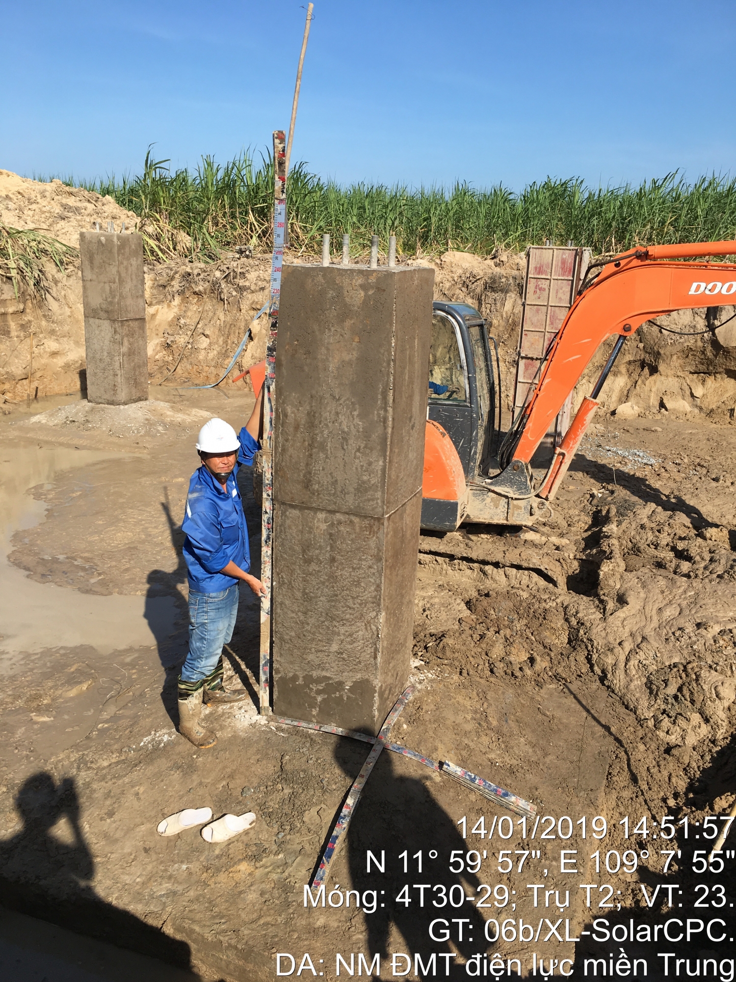 | Kỹ sư Nguyễn Lê Thuận bên móng trụ được hoàn thành đầu tiên của dự án Nhà máy ĐMT Điện lực miền Trung |