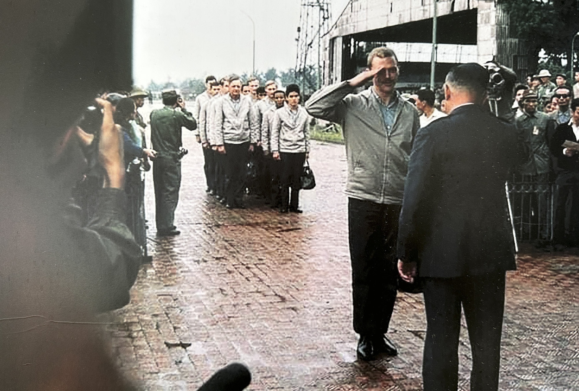 Đợt trao trả đầu tiên được thực hiện ngày 12/2/1973 tại sân bay Gia Lâm. Các đợt tiếp theo vào các ngày 18/2, ngày 4/3. 15h30 ngày 14/3/1973, Chính phủ Việt Nam hoàn tất việc trao trả toàn bộ phi công Mỹ. Trong ảnh là phi công Mỹ được trao trả tại sân bay Gia Lâm, năm 1973.