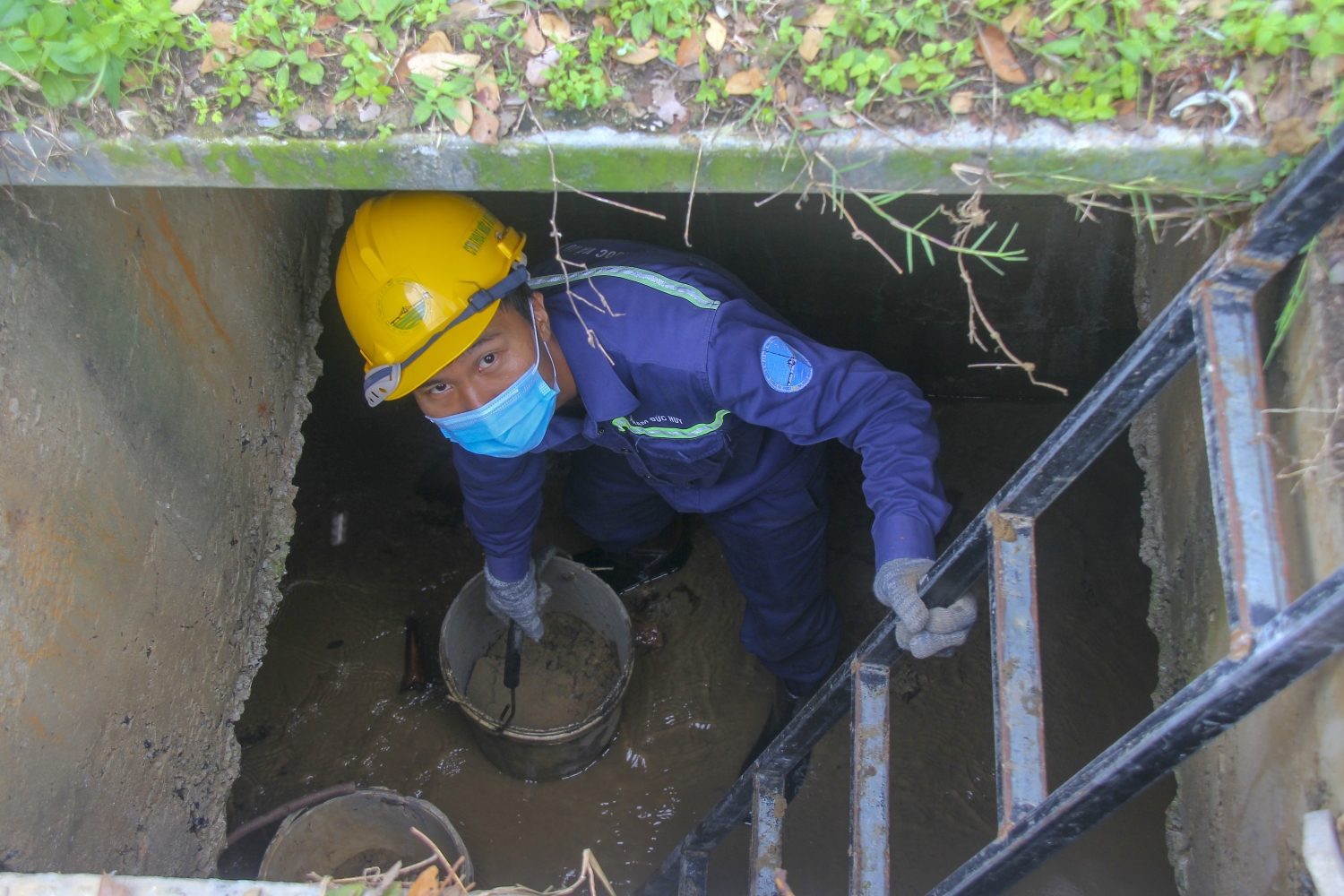 Hai nhân viên đầm mình dưới dòng nước thải đen ngòm, bốc mùi nồng nặc để xúc chất thải vào xô, đưa lên mặt đất.