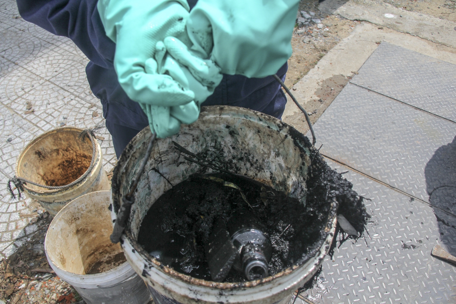 Xô chất thải đen ngòm, ngoài đất cát còn chứa rất nhiều rác thải sinh hoạt như chai thuỷ tinh và bao nilon. Đây là nguyên nhân khiến nhiều ống cống bị tắc nghẽn, không thể thoát nước do người dân vứt rác không đúng nơi quy định.