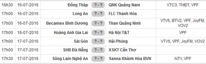 | Lịch thi đấu và tường thuật trực tiếp vòng 16 V.League |