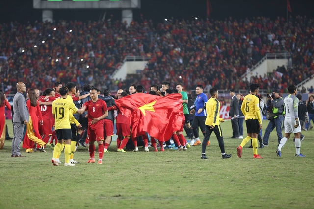 Sau khi tiếng còi trận chung kết lượt về AFF Cup 2018 vang lên, các tuyển thủ Việt Nam đã không kìm nén được niềm hạnh phúc. Các cầu thủ đã công kênh để thể hiện tình cảm với HLV Park Hang Seo trên sân Mỹ Đình.