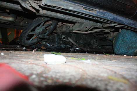 Một trong 5 chiếc xe gắn máy của người dân bị cuốn vào gầm xe kéo lê đi bị biến dạng hoàn toàn. Nhiều người dân cho hay, lúc rời khỏi xe tài xế Vũ có mùi bia rượu.