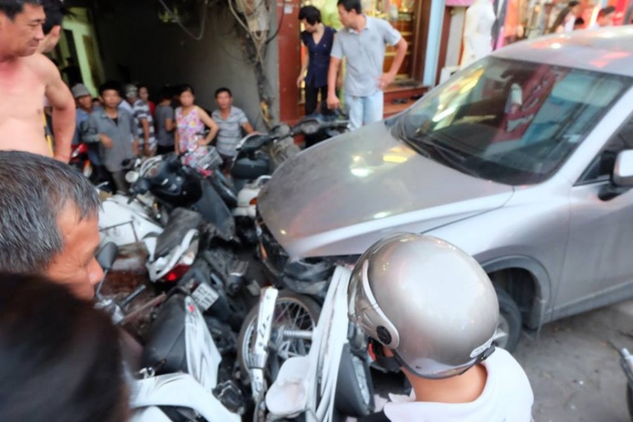 Do hoảng loạn, nữ tài xế đạp nhầm chân ga khiến chiếc xe tăng tốc và tông vào gần chục chiếc xe máy lưu thông cùng chiều.
