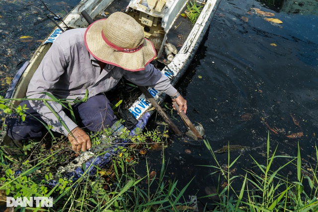 Không vì khó khăn mà bỏ cuộc, ông Cường và người cháu đã dùng lưới cá kéo rác từ kênh lên. Việc làm này vừa tiết kiệm được thời gian, vừa để bản thân ông Cường không phải tiếp xúc trực tiếp với nguồn nước dơ.