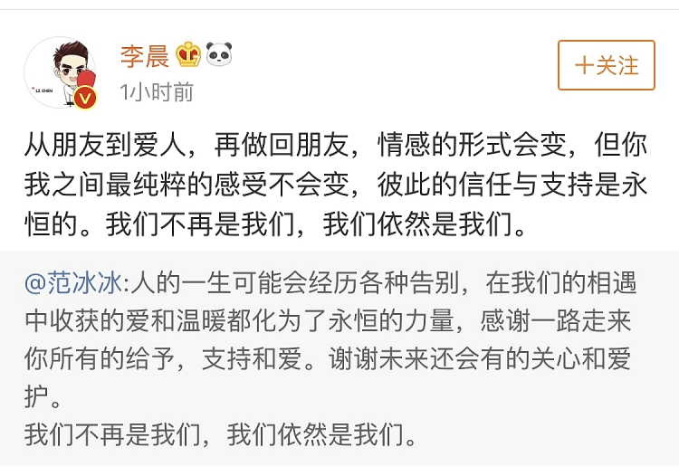 Ngay lập tức, Lý Thần cũng đã đáp lại: “Từ bạn trở thành người yêu, rồi lại trở thành bạn. Hình thức tình cảm sẽ thay đổi, nhưng những cảm xúc thuần túy giữa anh và em không hề đổi thay, đó chính là sự tin tưởng và ủng hộ lẫn nhau vẫn luôn còn mãi. Chúng ta đã không còn là chúng ta, chúng ta vẫn là chúng ta như cũ”.