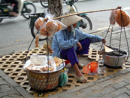 Vừa ngang qua đường Phạm Ngọc Thạch, chúng tôi đã gặp gánh hàng rong của một phụ nữ trẻ, nói rặt tiếng miền Nam. Chỉ trong không gian chật hẹp, chị đã có thể vừa pha bột, vừa chiên bánh, vừa gắp những chiếc bánh đã chín xếp gọn ghẽ vào mâm. Đầu gánh bên kia, cái lò than nhỏ được che bằng vỏ thùng giấy các tông. Tất cả đồ nghề đều lọt thỏm trong đôi quang gánh được chị che nilon rất kỹ để tránh bụi đường.