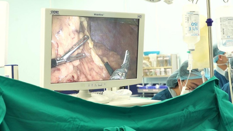 | Chỉ bằng 1 đường rạch nhỏ 5-10mm, các bác sĩ đã đưa camera và dụng cụ nội soi vào thực hiện cuộc mổ, trường mổ rộng, rõ ràng, các cấu trúc giải phẫu được phóng đại nhiều lần nên dễ phẫu tích. |