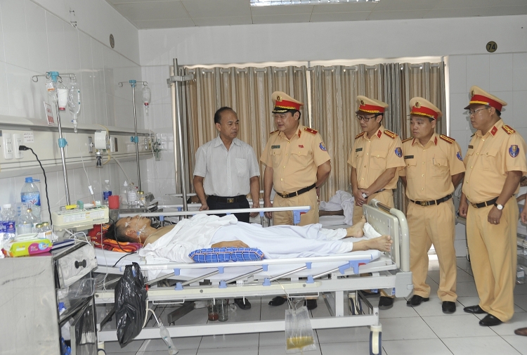 | Lãnh đạo Cục CSGT thăm hỏi, động viên Trung úy Nguyễn Hoàng (ảnh Báo giao thông). |