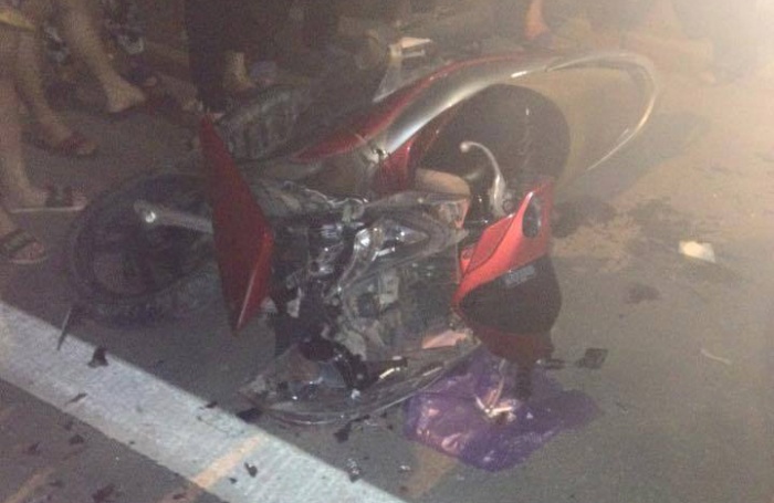 | Chiếc xe máy vỡ vụn phần đầu sau va chạm |