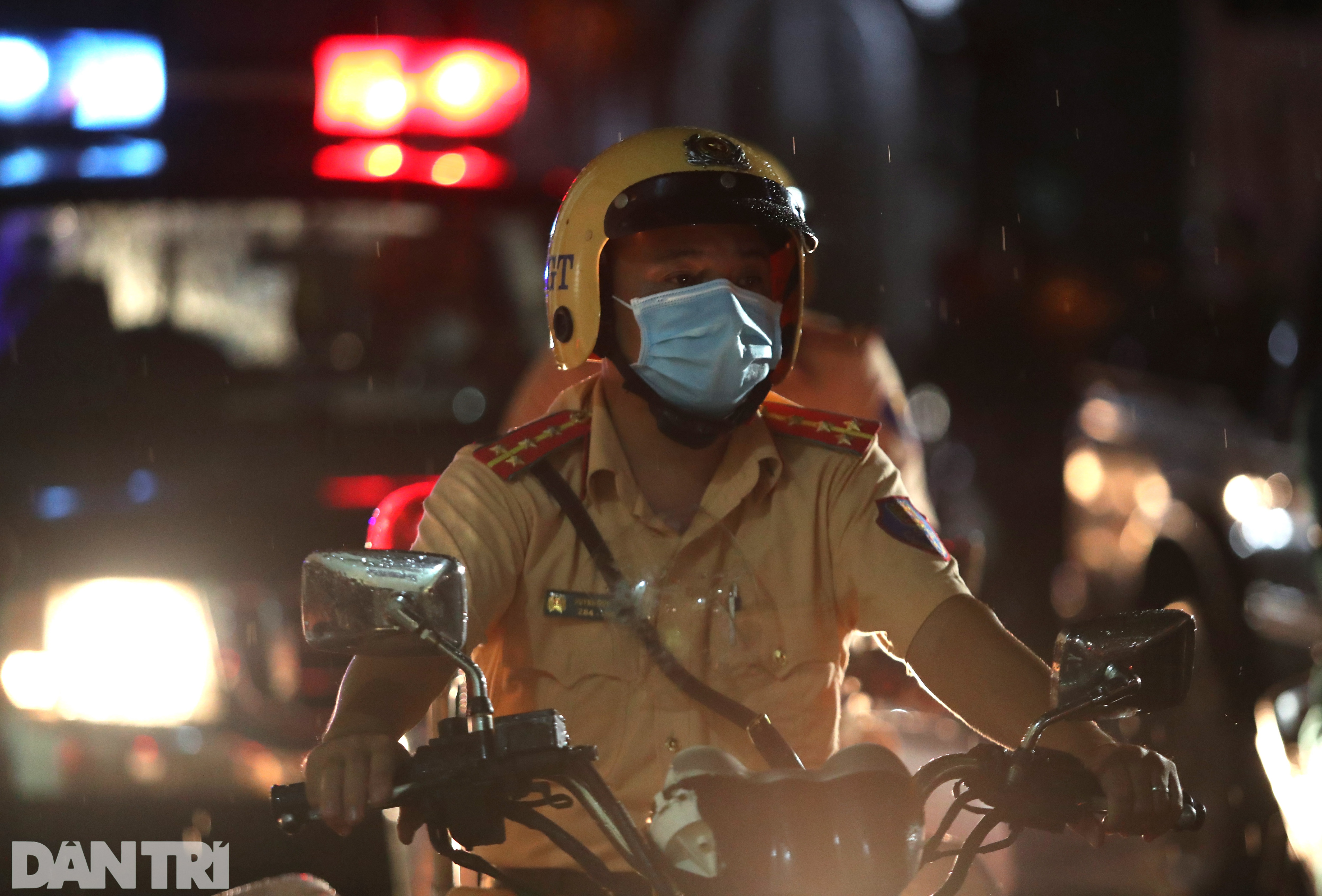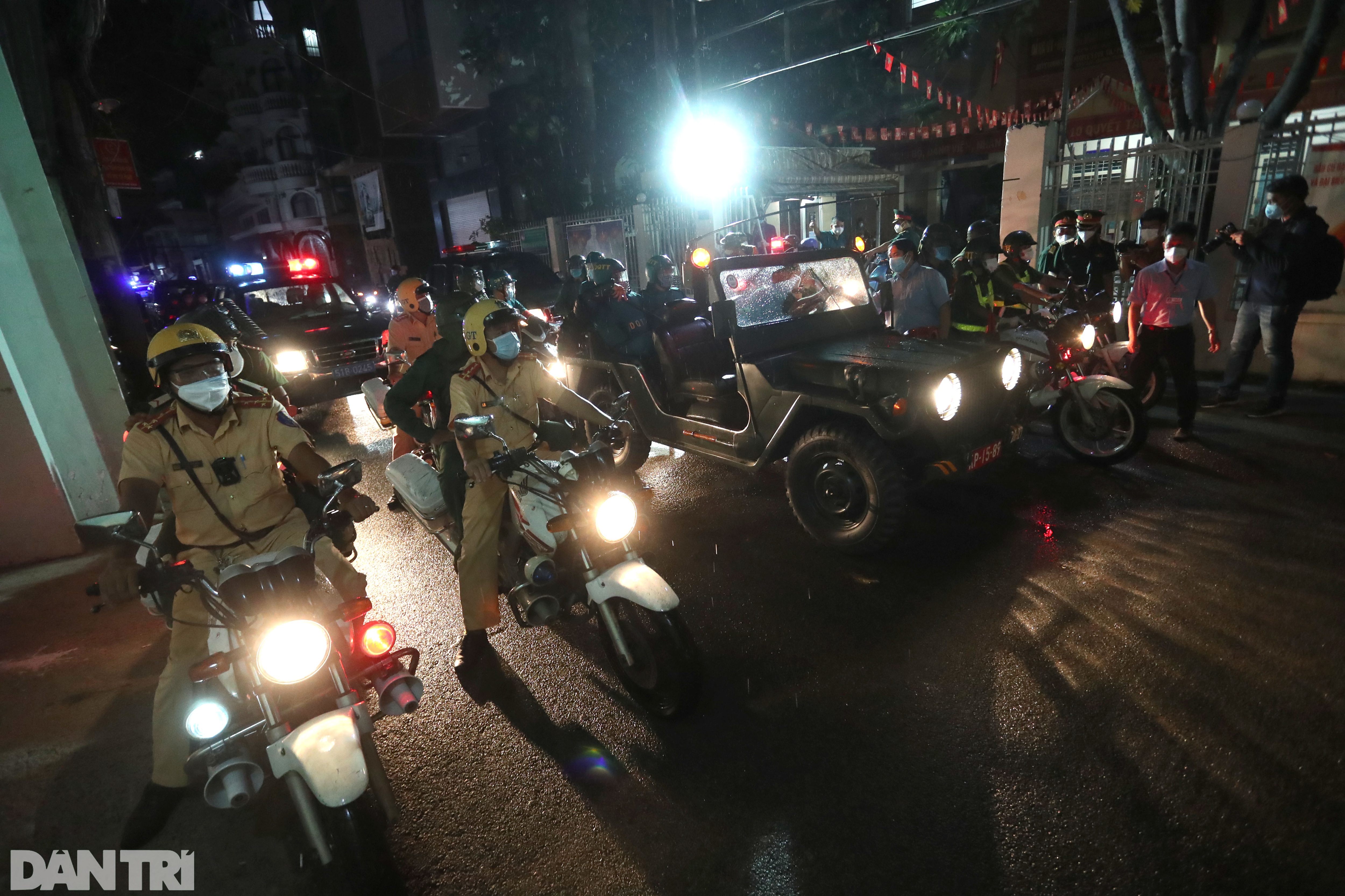 Các cán bộ, chiến sĩ xuất phát trong mưa, làm nhiệm vụ xuyên đêm để tăng cường công tác phòng chống dịch Covid-19 trên địa bàn.