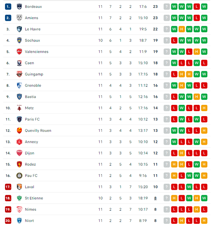 | Bảng xếp hạng Ligue 2 sau lượt đấu đêm qua. |