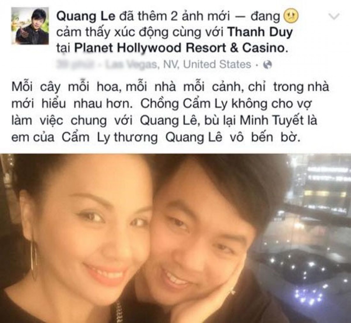 Có thể thấy qua đoạn chia sẻ trên thì Quang Lê đang có mối quan hệ không mấy suôn sẻ với vợ chồng ca sĩ Cẩm Ly. Cụ thể là chồng của Cẩm Ly là nhạc sĩ Minh Vy không muốn hợp tác cùng Quang Lê. Thế nhưng trái lại thì em gái Minh Tuyết lại thân thiết và quý mến Quang Lê. Quang Lê kèm theo tấm ảnh minh họa anh và ca sĩ Minh Tuyết kề má khá thân mật.