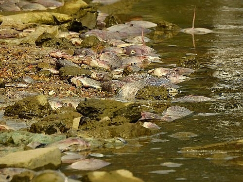 | Cá chết dạt vào bờ thành từng mảng lớn. Ảnh: Minh Cương. |