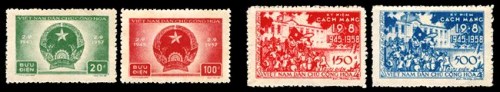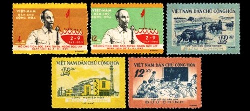 Bộ tem "Kỷ niệm lần thứ 12 Quốc khánh nước Việt Nam Dân chủ Cộng hoà" gồm 02 mẫu, phát hành năm 1957 (bên trái) và bộ tem "Kỷ niệm lần thứ 13 Cách mạng Tháng Tám" gồm 02 mẫu, phát hành năm 1958.