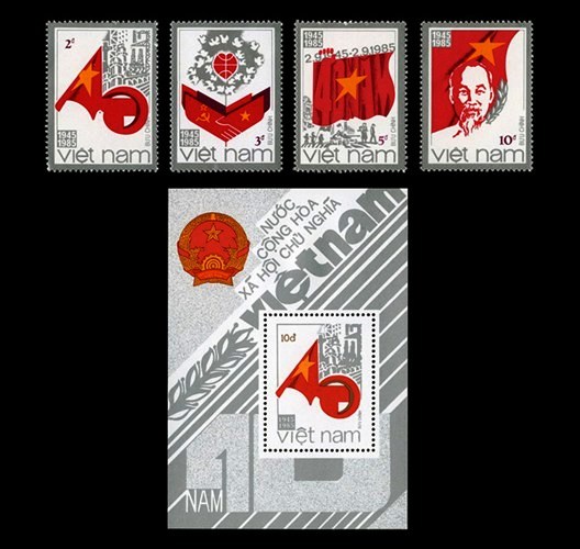 Bộ tem "Kỷ niệm lần thứ 40 Cách mạng tháng 8 và Quốc khánh 2/9" gồm 04 mẫu, 01 Bloc, phát hành năm 1985.
