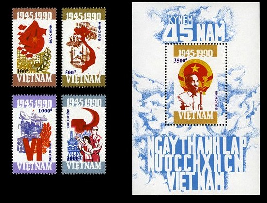 Bộ tem "Kỷ niệm 45 năm ngày thành lập nước CHXHCN Việt Nam" gồm 04 mẫu, 01 Bloc, phát hành năm 1990.