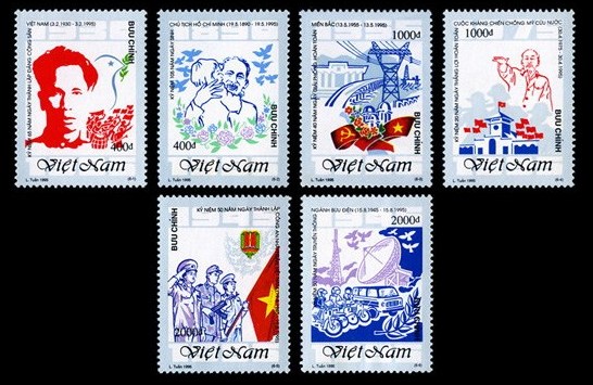 Bộ tem "Kỷ niệm 50 năm Cách mạng tháng Tám và Quốc khánh 2/9" gồm 06 mẫu, phát hành năm 1995.