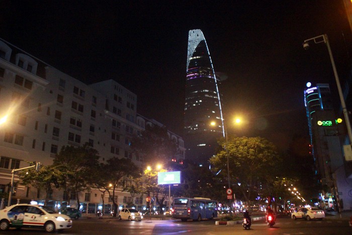 | Tòa nhà Bitexco “thoắt ẩn, thoắt hiện” trong màn đêm. |