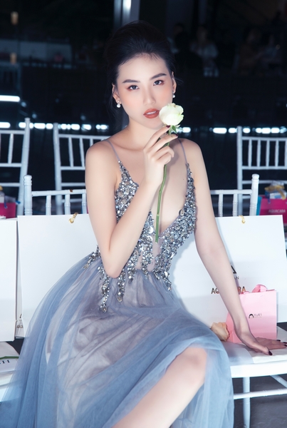 Chất liệu xuyên thấu của trang phục vừa quyến rũ nhưng không quá phô phang, tôn lên nét thanh lịch, tinh tế cho người đẹp sinh năm 1998. Chi tiết đính đá trên nền trang phục khiến Quỳnh Hoa trở nên quý phái, nổi bật hơn.