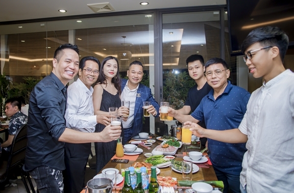 | Trong buổi tiệc Việt Anh cũng vui mừng khi gặp lại ca sĩ Quang Hà cùng rất nhiều bạn bè khác tại Hà Nội |