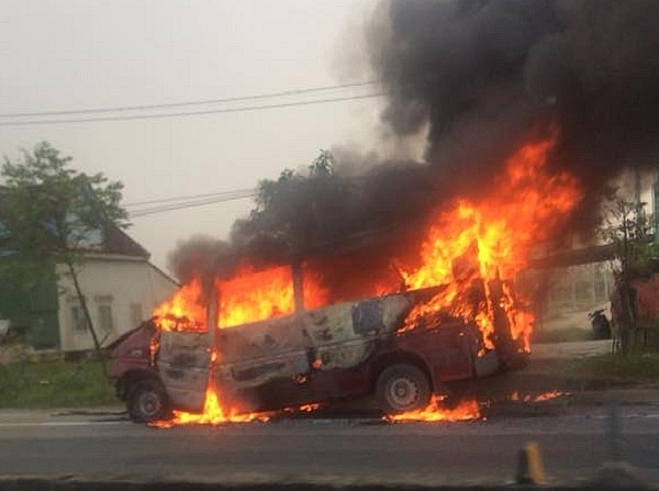 | Xe khách 16 chỗ bốc cháy dữ dội sau tai nạn. |