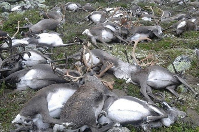 | Hình ảnh tuần lộc chết la liệt do bị sét đánh |