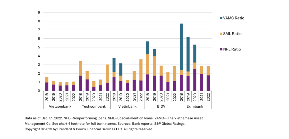 Trong bối cảnh nợ xấu các ngân hàng tăng mạnh, có những ngân hàng chịu mức tăng lên đến 4-5%, S&P dự báo tỉ lệ nợ xấu của TCB có thể được kiểm soát trong vòng 12-18 tháng tới. Các chính sách hỗ trợ của Chính phủ như cắt giảm lãi suất, các gói tín dụng hỗ trợ và ổn định thị trường trái phiếu sẽ giảm bớt rủi ro và tác động đối với ngành ngân hàng, và thị trường nói chung. Rủi ro chính là năm 2023 kinh tế hồi phục chậm hơn so với kỳ vọng, bởi yếu tố nội địa hoặc toàn cầu, như lãi suất tăng cao, thanh khoản thấp, khủng hoảng niềm tin đối với nền kinh tế hoặc sức hồi phục yếu ở thị trường BĐS.