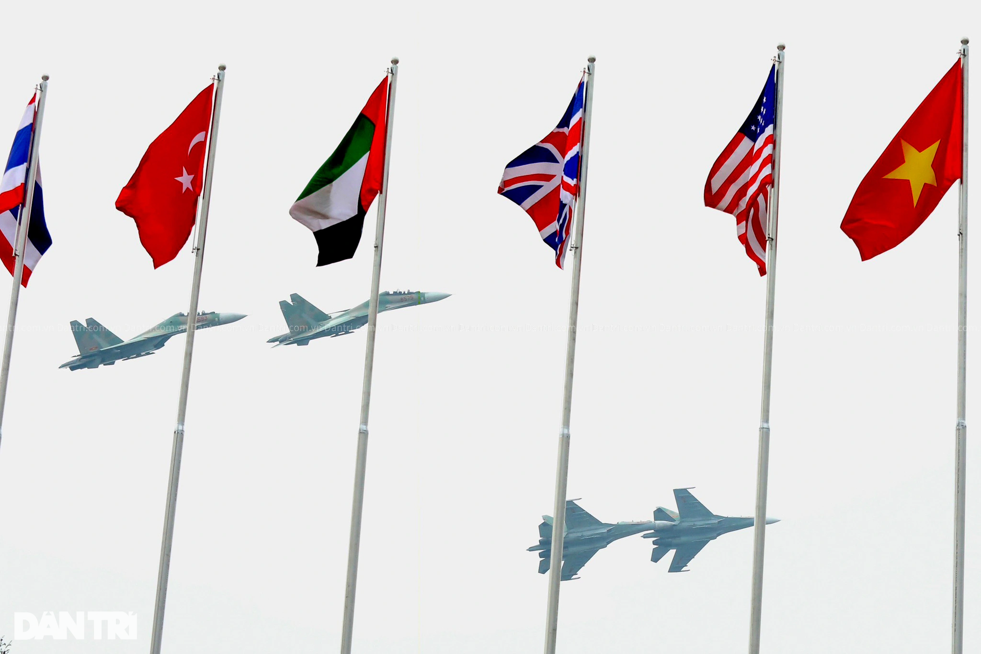 Biên đội 4 chiếc Su-30MK2 bay qua dãy cờ các quốc gia trên đường băng sân bay Gia Lâm (Ảnh: Hữu Nghị).