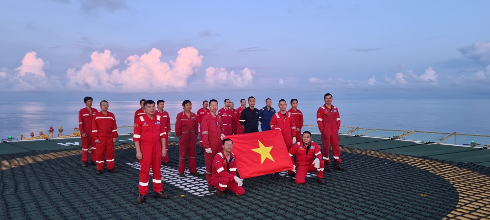 | 04-PDD-AD-0004: Chuẩn bị Lễ Chào cờ ngày Quốc khánh. Ảnh chụp anh em nhân viên chuẩn bị làm lễ Chào cờ lúc 5h55 sáng ngày Quốc khánh 2/9/2021 tại giàn Mộc Tinh 1, ngày rất đặc biệt, thời điểm cả nước đang căng mình chống dịch Covid -19. |