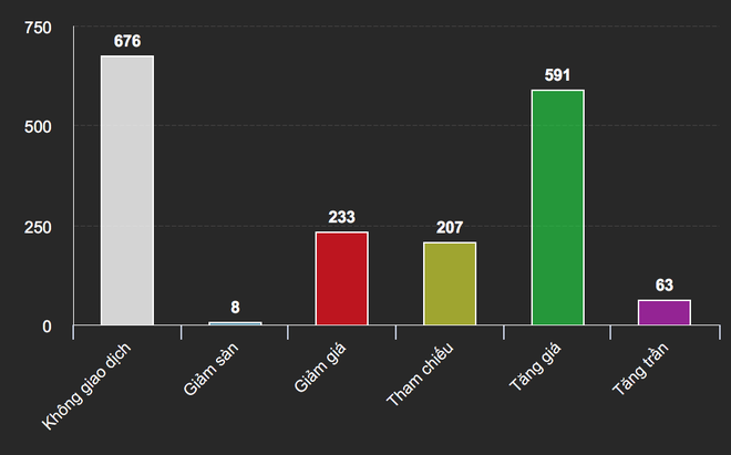 Tiền vào thị trường dứt khoát và lan tỏa giúp 591 mã cổ phiếu tăng giá và có đến 63 mã tăng trần. Con số này vượt xa số lượng mã giảm là 233 mã, 8 mã giảm sàn.