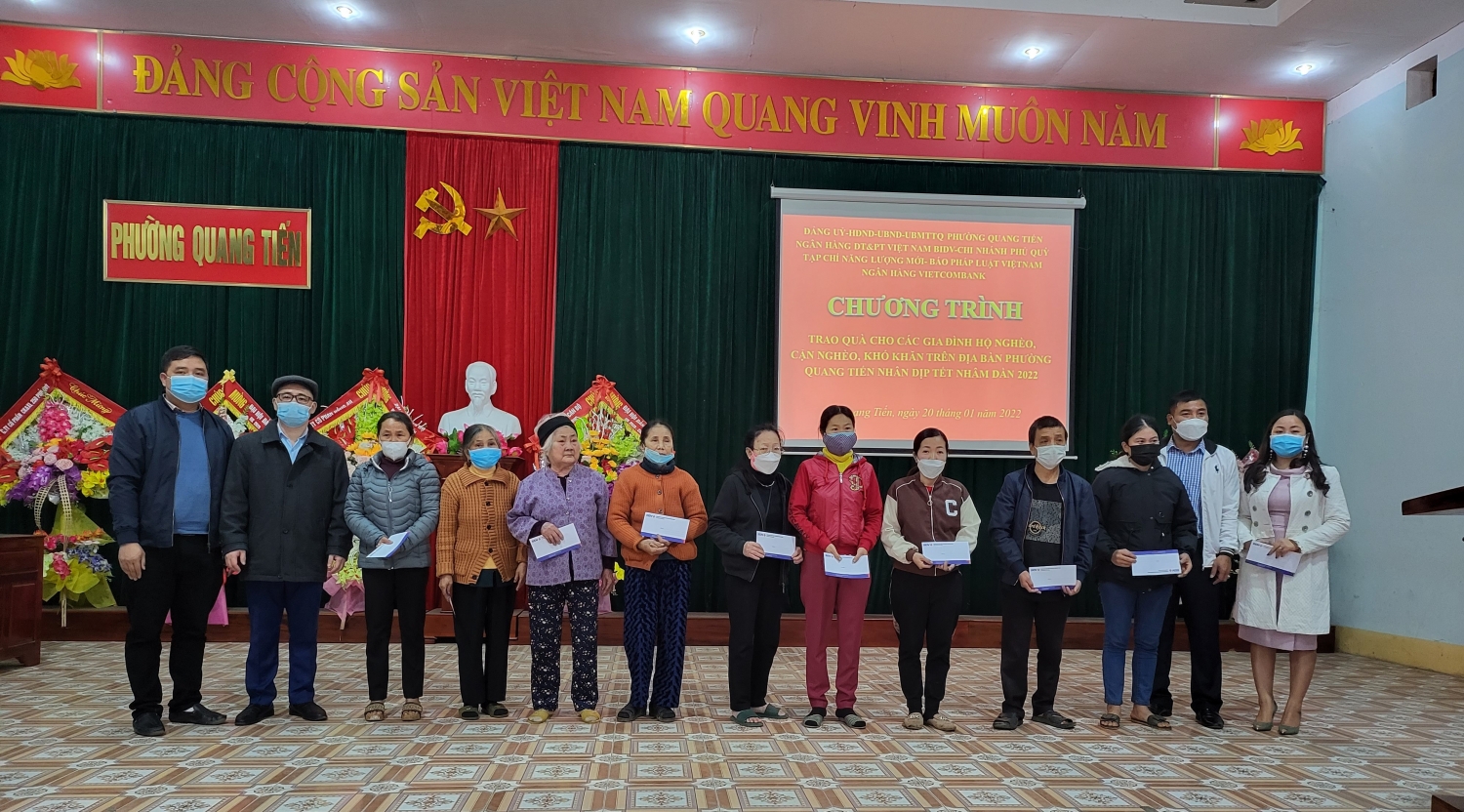 Nhằm chia sẻ với những hoàn cảnh khó khăn trên địa bàn phường Quang Tiến, thị xã Thái Hòa, Tạp chí Năng lượng Mới - Petrotimes phối hợp với Ngân hàng TMCP Đầu tư và Phát triển Việt Nam (BIDV) - Chi nhánh Phủ Quỳ trao 120 suất quà cho hộ nghèo, hộ cận nghèo, hộ đặc biệt có hoàn cảnh khó khăn mỗi suất quà 500.000đ tiền mặt và quà tết.