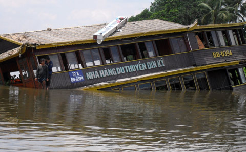Trong tích tắc, cả con thuyền đổ nhào khiến bàn ghế, thức ăn và các vật dụng khác đè vào những phụ nữ và trẻ em. Nhiều người gượng dậy định thoát ra nhưng lại tiếp tục bị bàn ghế xô tới. Nước ào ào đổ vào. Các nhân viên của Dìn Ký vội vã nhảy ra ngoài tàu. Sau lưng họ là những cánh tay trẻ thơ chới với trong tiếng khóc. Tiếng gào thét, kêu la chỉ vang lên giây lát rồi tắt lịm dưới làn nước. Anh Long, Hưng, ông Tài… quáng quàng lao về phía họ nhưng đã quá muộn. Nước đã nhấn chìm tất cả. “Cứu mấy đứa nhỏ…”, ông Tài hét lên.