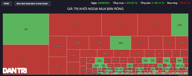 | Nhà đầu tư ngoại bán ròng hơn 773 tỷ đồng trên HSX phiên 20/8 (Ảnh chụp màn hình - MBS). |