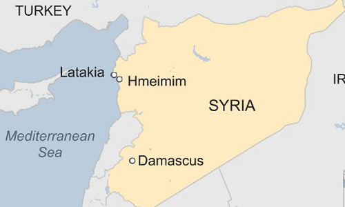 | Vị trí căn cứ không quân Hmeymim của Nga ở Syria. Đồ họa: BBC. |