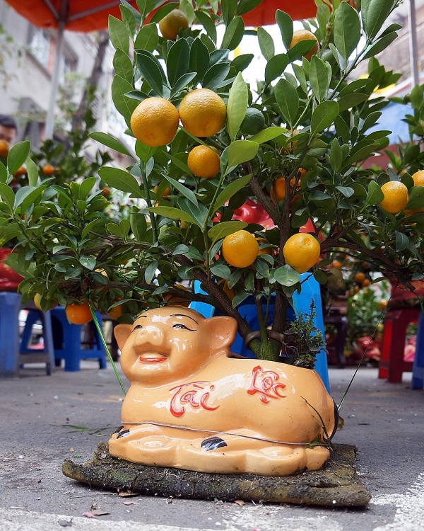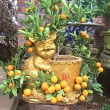 | Tết 2019 là Tết Kỷ Hợi nên biểu tượng hình chú heo lên ngôi. Quất bonsai trồng trong heo đất với chữ Tài Lộc mang tới may mắn, sung túc dịp năm mới. |