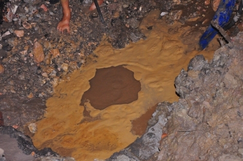 Điểm vỡ ống nước, nước sạch phun lên mặt đất.