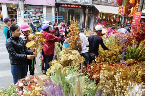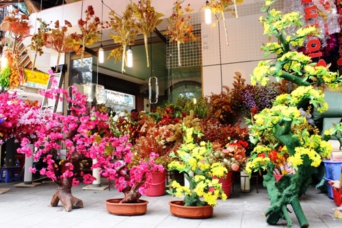 Bên cạnh những loại đồ trang trí nhà cửa, các loại hoa giả để trang trí cũng được nhiều người dân quan tâm. Nhiều tiểu thương kinh doanh mặt hàng này cho biết, những năm gần đây mặt hàng hoa giả ngày càng thu hút được một lượng lớn người tiêu dùng. Màu sắc đẹp, rực rỡ, tự nhiên mà lại để được lâu là những tiện ích trông thấy của sản phẩm này. Giá cả cũng có nhiều loại từ rẻ đến đắt tùy thuộc vào chất liệu hoa, thông thường một chậu hoa có giá từ vài trăm cho đến một triệu đồng. Cụ thể, chùm ngũ quả giả giá 33.000 đồng/chùm, cành hoa giả giá 20.000 đồng/cành, hoa tulip giá 50.000 đồng/cành, chậu mai, chậu đào gí từ 190.000 đến 500.000 đồng/chậu,