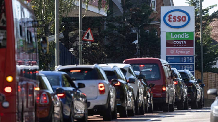| Hàng dài xe ô tô chờ đổ xăng trước một trạm xăng của Shell tại trung tâm London hôm 26/9/2021. Ảnh: Henry Nicholls/Reuters. |