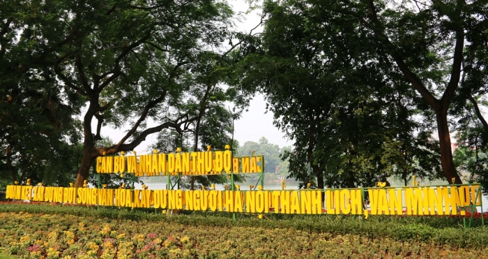 | Khu vực trung tâm Thủ đô, ven hồ Gươm, những tấm áp phích, dòng chữ mang nội dung kỉ niệm ngày lễ lớn của đất nước. |