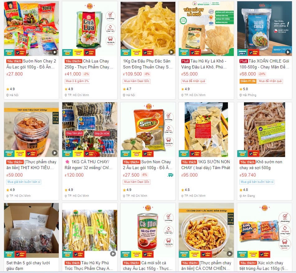 Nhờ vào sự phát triển của thị trường online, thực phẩm chay cũng xuất hiện trên các sàn thương mại điện tử, đa dạng với giá cả khác nhau.